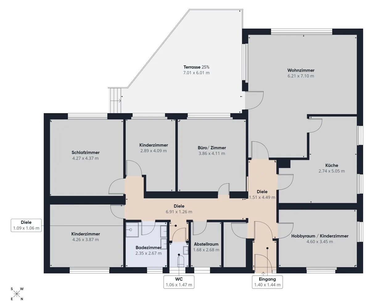 Auf rund 177 m² Wohnfläche verteilen sich insgesamt 6 Zimmer, die ausreichend Platz für die ganze Familie, Arbeiten von zu Hause oder individuelle Wohnkonzepte bieten. Besonders hervorzuheben ist die großzügige Deckenhöhe, die zusammen mit den großen Fensterflächen für ein offenes, lichtdurchflutetes Wohnambiente sorgt und dem Haus einen angenehmen Altbaucharakter verleiht. Die sonnige Terrasse in Südausrichtung öffnet sich zum ca. 800 m² großen Garten – ein echtes Highlight für Familien, Gartenliebhaber oder alle, die Ruhe und Privatsphäre im Grünen schätzen. Der Garten bietet vielfältige Nutzungsmöglichkeiten und ausreichend Raum für Freizeit, Spiel und Entspannung. Im Innenbereich unterstreichen Parkettböden den zeitlosen Charakter des Hauses. Die klare, ebenerdige Bauweise macht den Bungalow zudem besonders komfortabel und flexibel nutzbar – sowohl heute als auch mit Blick auf die Zukunft.