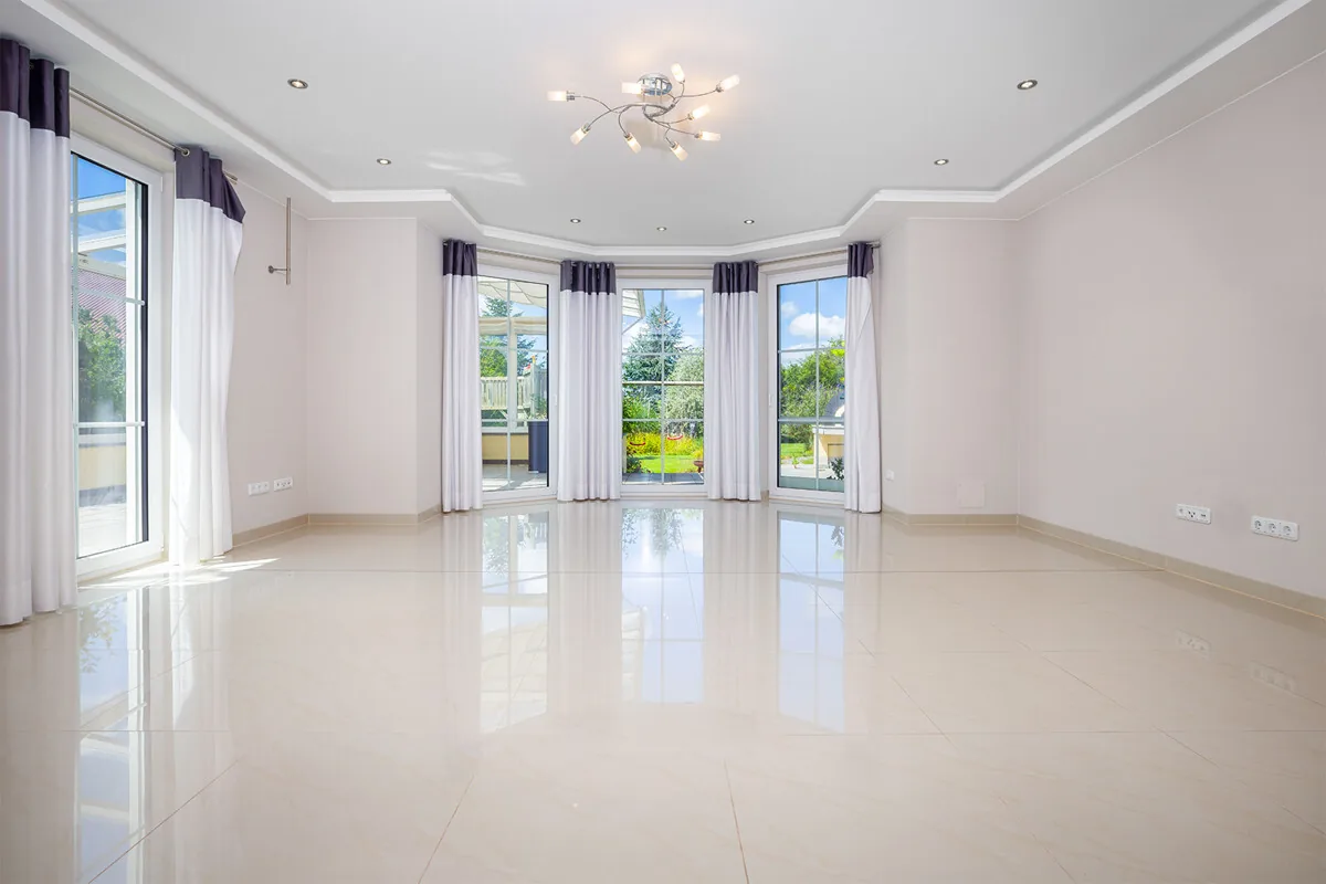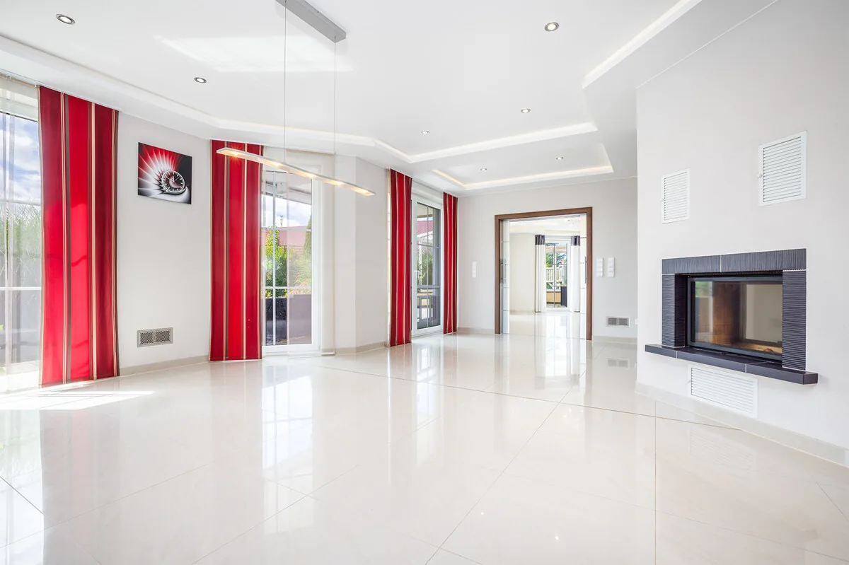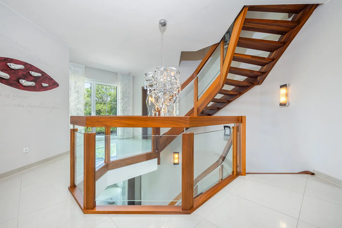 Im Erdgeschoss empfängt Sie eine repräsentative Galerie mit einem Aquarium, die direkt in den Wohn- und Essbereich, den Küchenbereich sowie das Wohnzimmer mit bodentiefen Fenstern führt. Von hier gelangen Sie auf die südausgerichtete Terrasse. Die Einfahrt bietet Platz für mehrere Fahrzeuge, und eine unterkellerte Doppelgarage sorgt für zusätzlichen Stauraum.