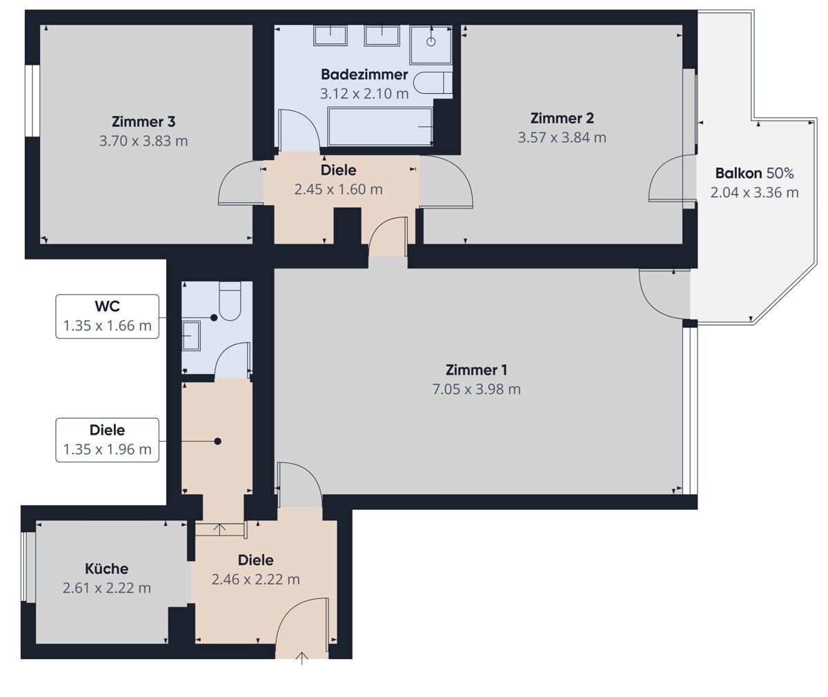 Diese großzügige Wohnung mit rund 87 m² Wohnfläche befindet sich im Hochparterre eines gepflegten Mehrfamilienhauses. Die durchdachte Aufteilung ermöglicht eine flexible Nutzung: Insgesamt sind drei gut geschnittene Zimmer separat zugänglich, sodass sich die Wohnung ideal für Familien, Paare oder auch als Wohngemeinschaft eignet. Küche und Badezimmer verfügen jeweils über einen eigenen Zugang, was den Grundriss besonders praktisch macht. Zwei der Wohnräume öffnen sich direkt zum Balkon und bieten einen schönen Blick ins Grüne. Beheizt wird die Wohnung über eine Gaszentralheizung mit klassischen Heizkörpern. Aktuell ist die Ausstattung renovierungsbedürftig: Böden, Bad, Türen sowie die Küche sollten erneuert werden. Gerade darin liegt jedoch ein erhebliches Potenzial – mit überschaubarem Modernisierungsaufwand lässt sich ein zeitgemäßes und sehr attraktives Wohnambiente schaffen.Für Kapitalanleger ist die Immobilie besonders interessant: Nach erfolgter Renovierung lässt sich ein Kaltmietpreis von etwa 1.150 € monatlich realisieren. Damit bietet die Wohnung eine solide Rendite und gleichzeitig die Chance auf langfristige Wertsteigerung.